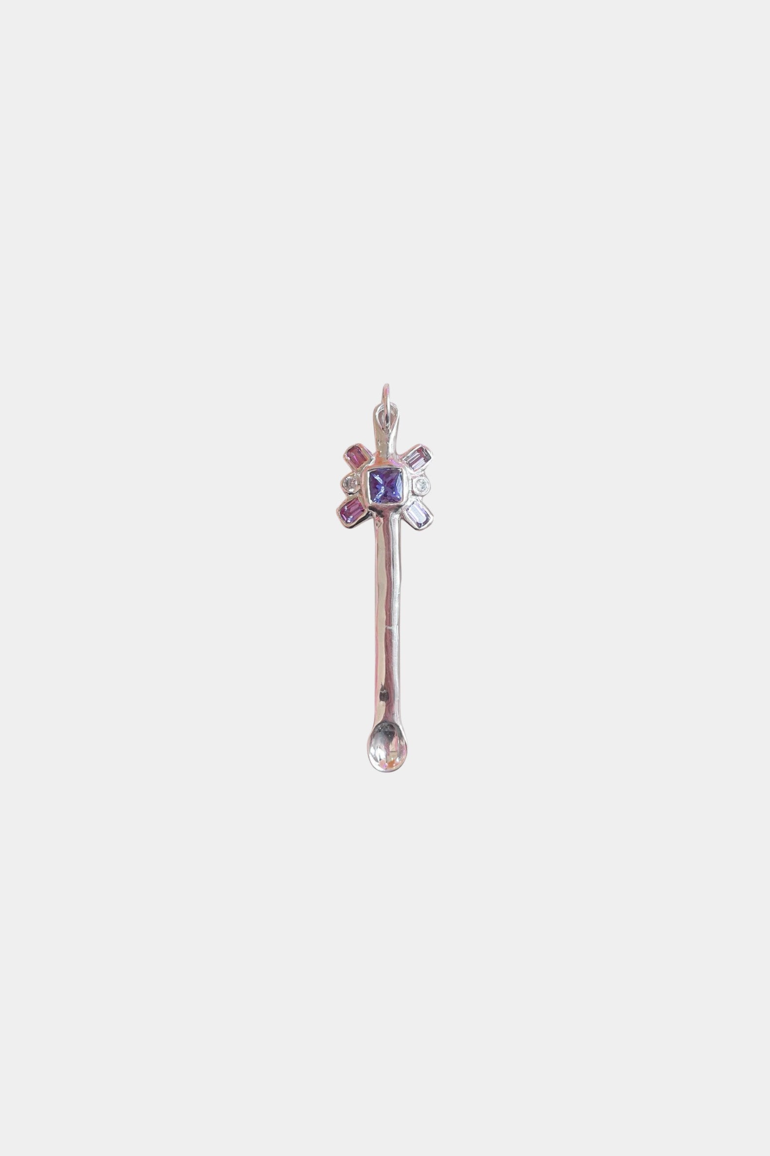 This spoon is made with white CZs, pink and purple sapphires and a cushion cut tanzanite and set in sterling silver.