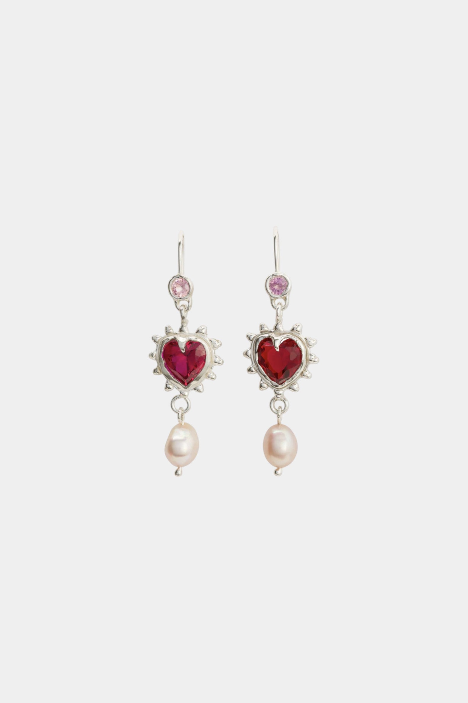 The I Love Pearls Earrings~ made from a natural pink sapphire, a nano ruby heart and a dangling pearl.