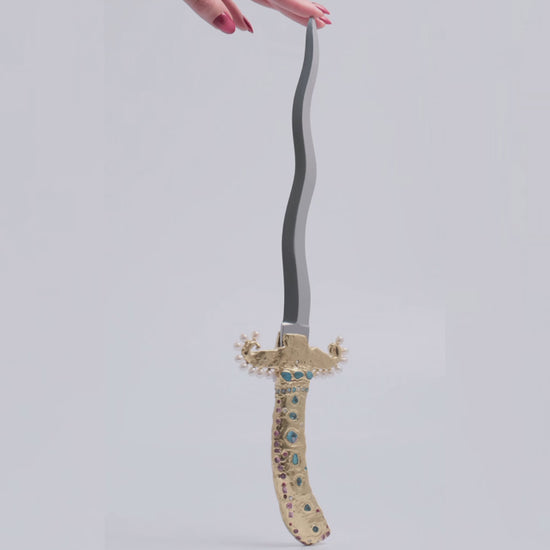 ~ Sterling silver plated in 18k yellow gold vermeil with a steel blade. Set with sapphires, topaz, appatite, Aussie opals and pearls.