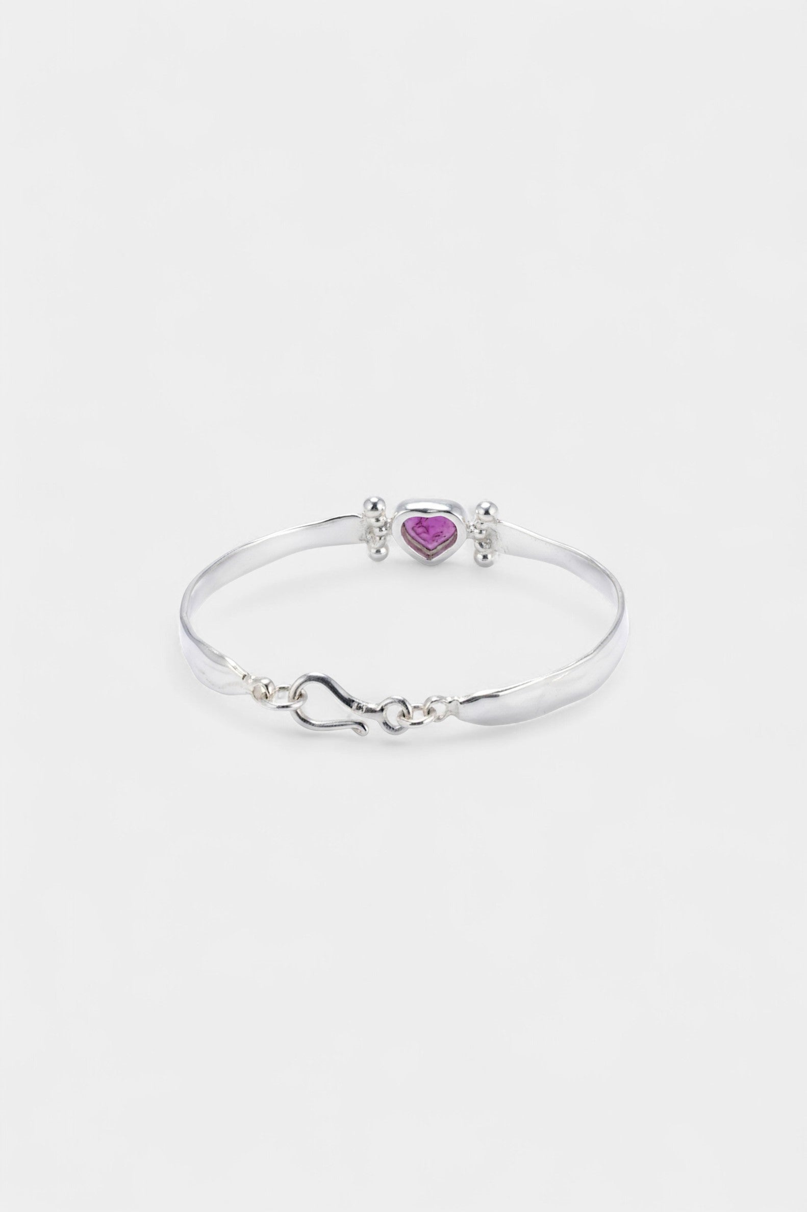 A natural addition to the heart collection! The Ruby Heart Bangle is available in sterling silver, an 18k yellow gold vermeil or 9k solid yellow gold and set with our signature 10mm heart cut nano ruby. Fastens with a hook at the back.