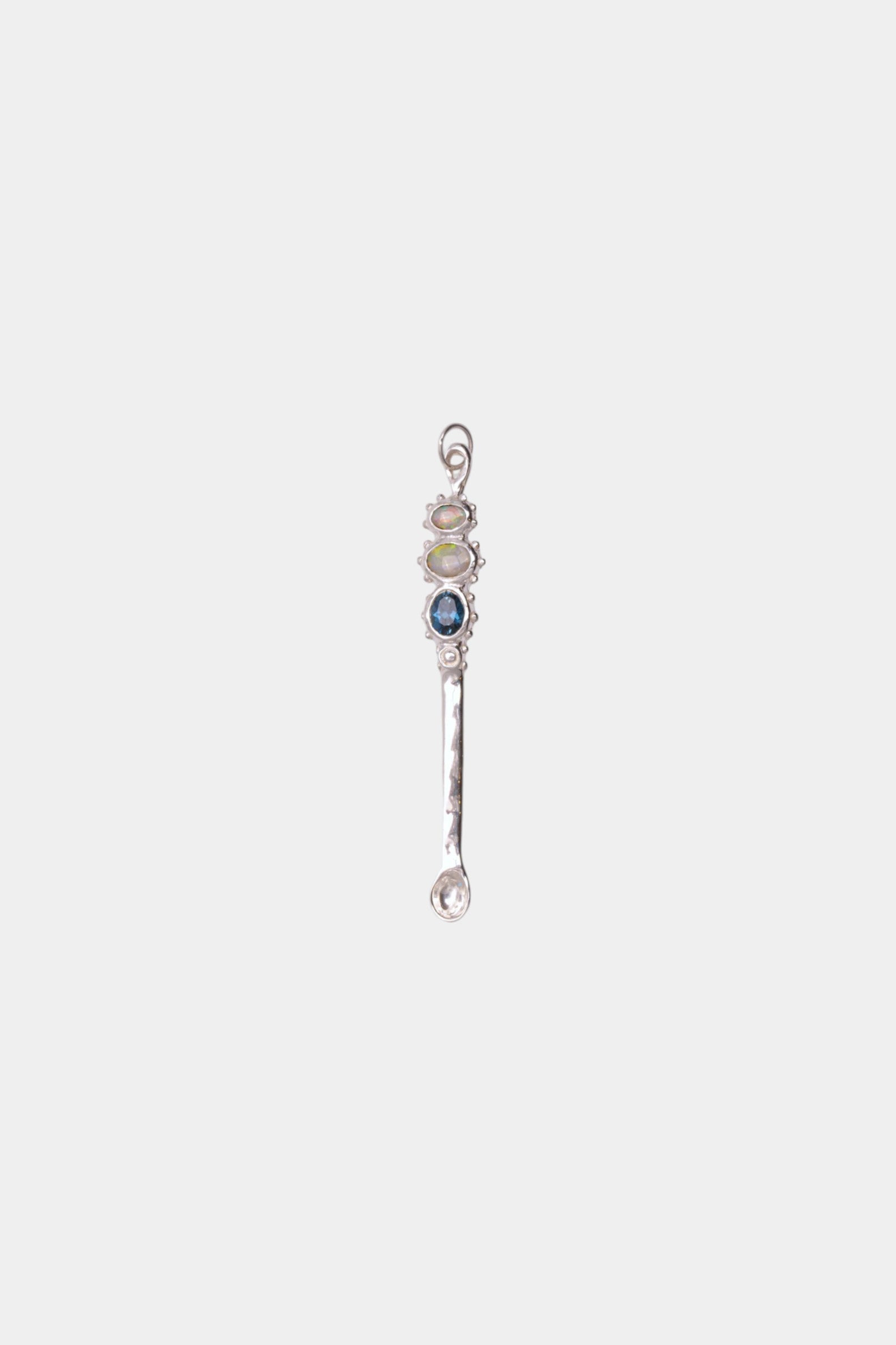 This spoon is made with solid opals and a blue topaz and set in sterling silver.